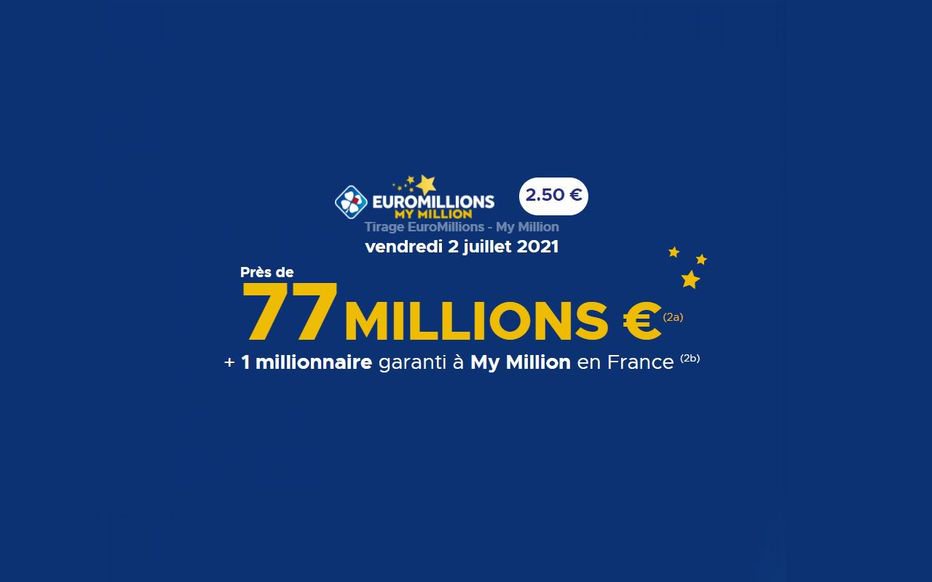 Résultat et gains euromillions en direct. Tirage euromillions vendredi 2 juillet 2021 77 millions € à gagner. Euromillions is a transnational lottery that requires seven correct numbers to win the jackpot. There was no winner of the euromillions jackpot. The 1,438th euromillions draw took place on friday 2nd july 2021 and the following numbers were drawn